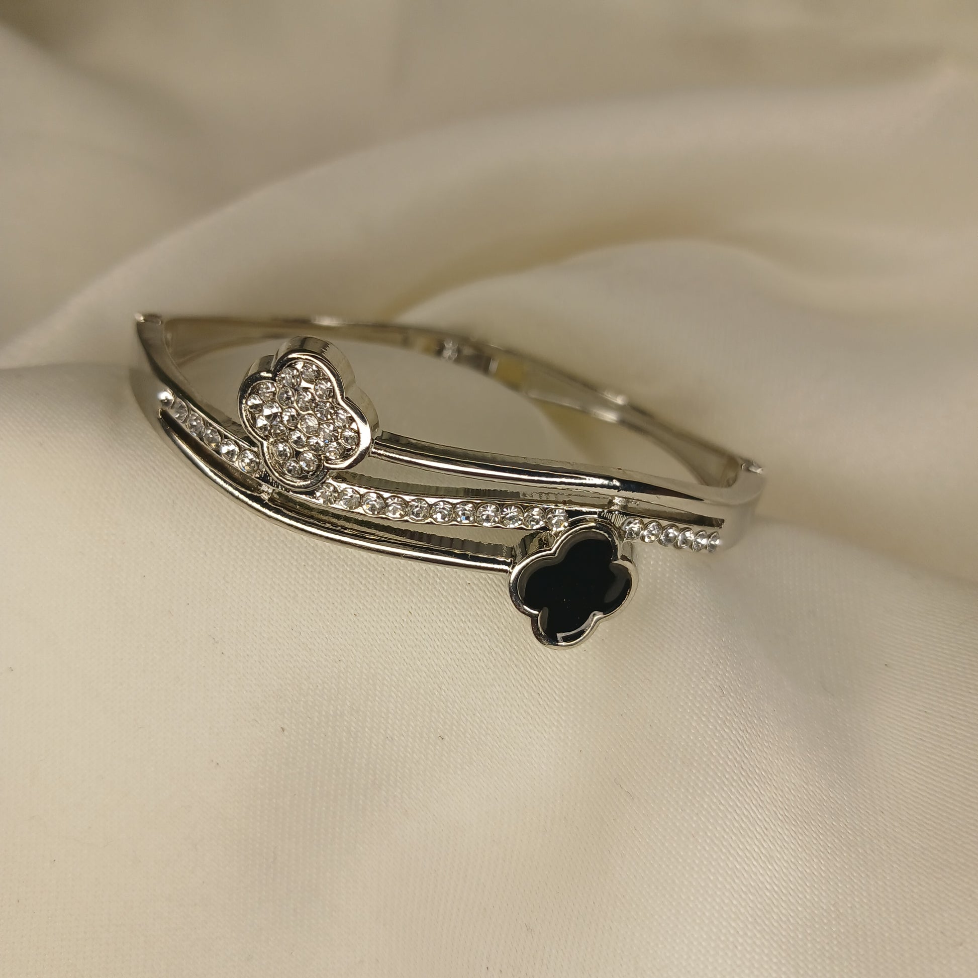 Enhance your jewelry collection with this exquisite clover-design bracelet, crafted for those who appreciate sophistication and style. This stunning piece features a delicate clover motif, with one side adorned with sparkling crystal stones and the other featuring a sleek black enamel finish for a contemporary touch.