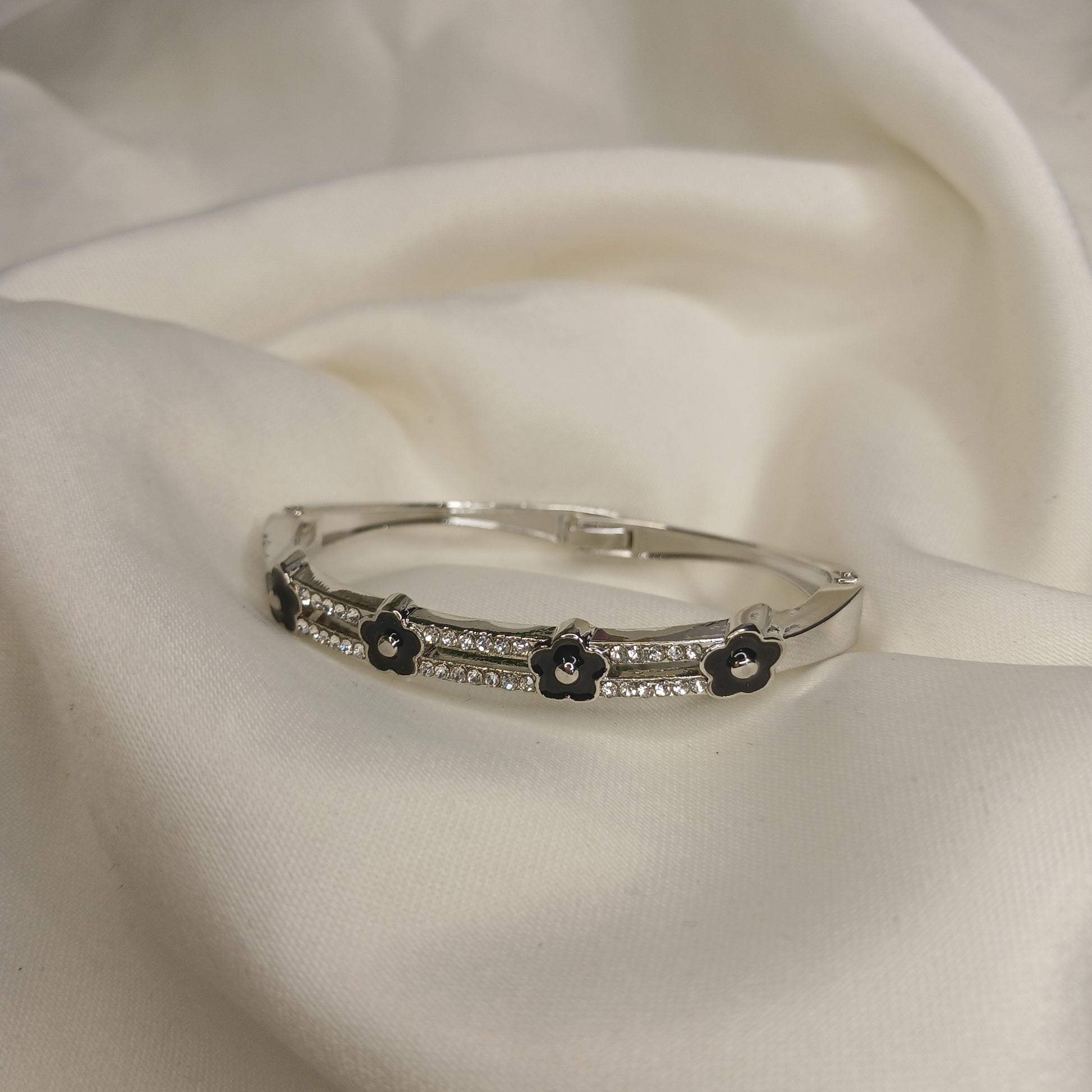 Elevate your style with this stunning floral bracelet, designed to add a touch of elegance to any outfit. Crafted from premium-quality metal, this sleek bangle features delicate black enamel flowers paired with dazzling crystal stones for a sophisticated finish. Its secure hinged closure ensures a comfortable fit, making it perfect for daily wear or special occasions.