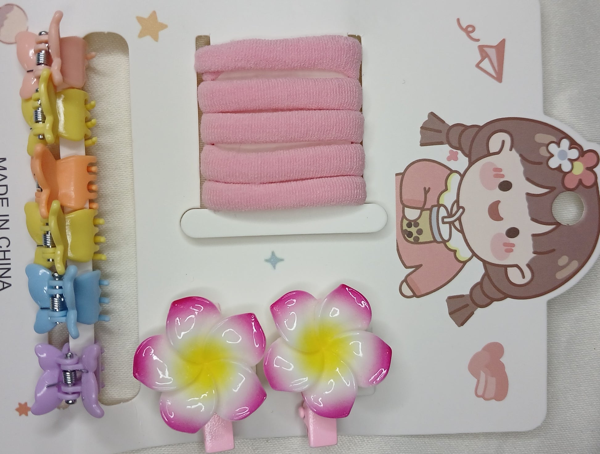 Cute Hair Accessories Pack (Pastel Theme) –This set includes hair ties, tropical flower clips, and mini colorful claw clips, ideal for a fun and vibrant look.