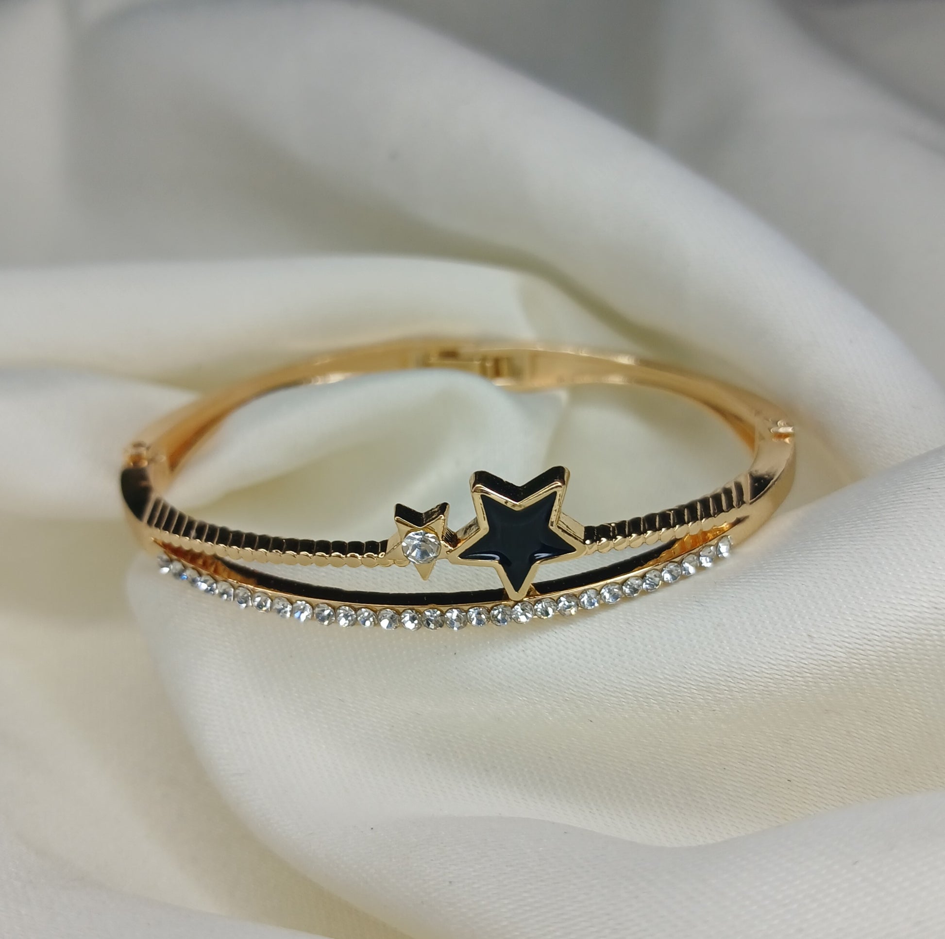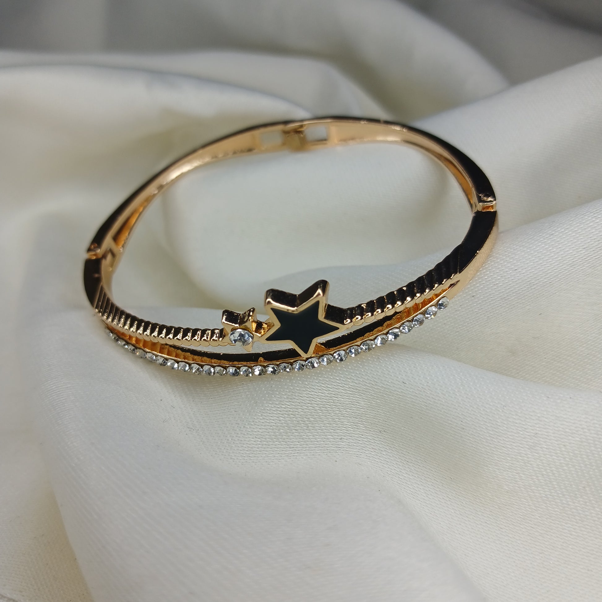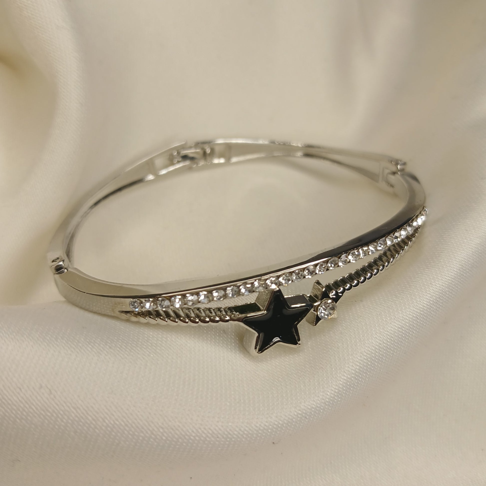 Illuminate your style with this gorgeous star bangle bracelet, designed for those who love a touch of celestial elegance. Featuring a black enamel star charm and dazzling white crystals, this bracelet is available in two luxurious finishes: silver and gold.