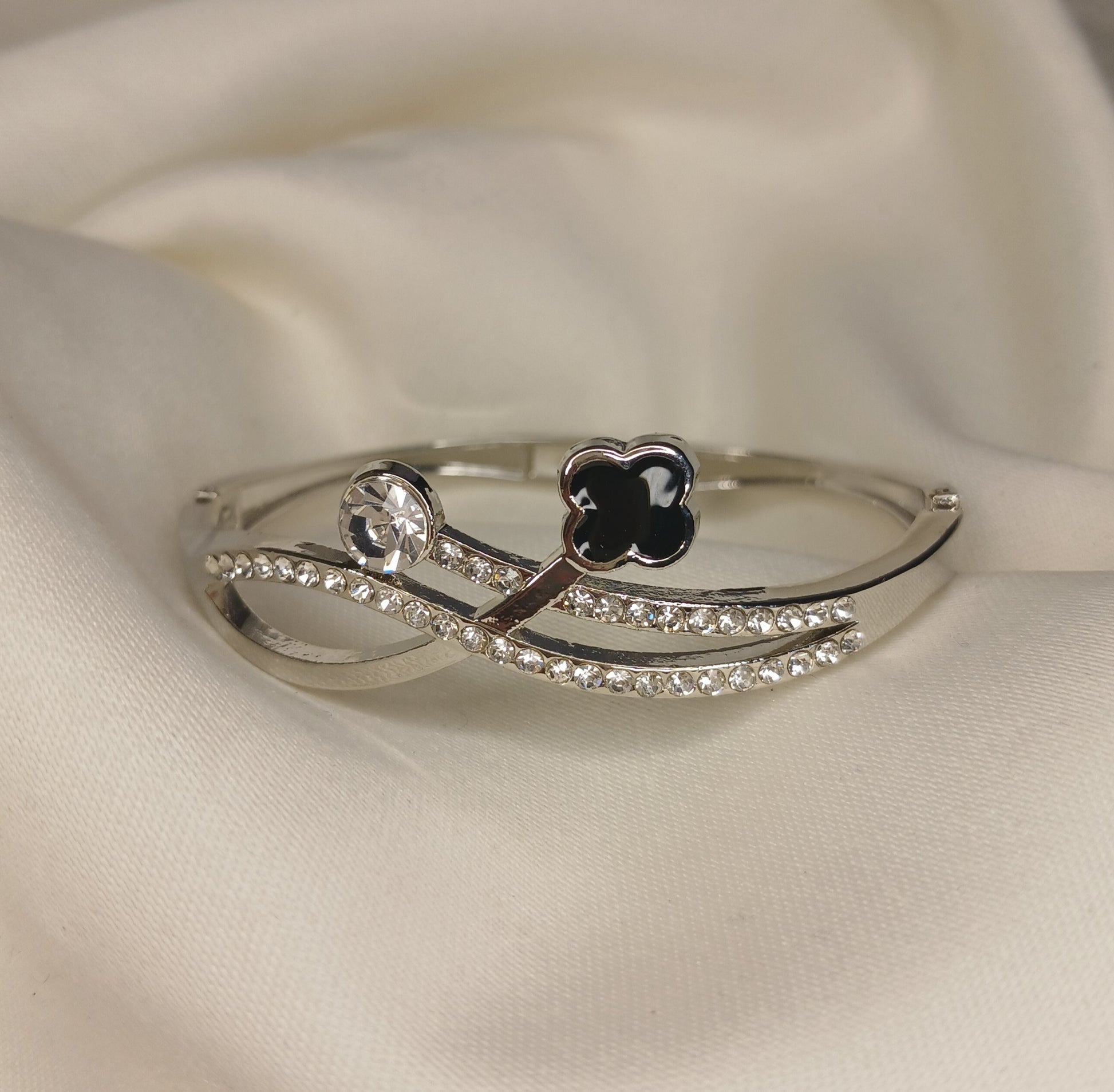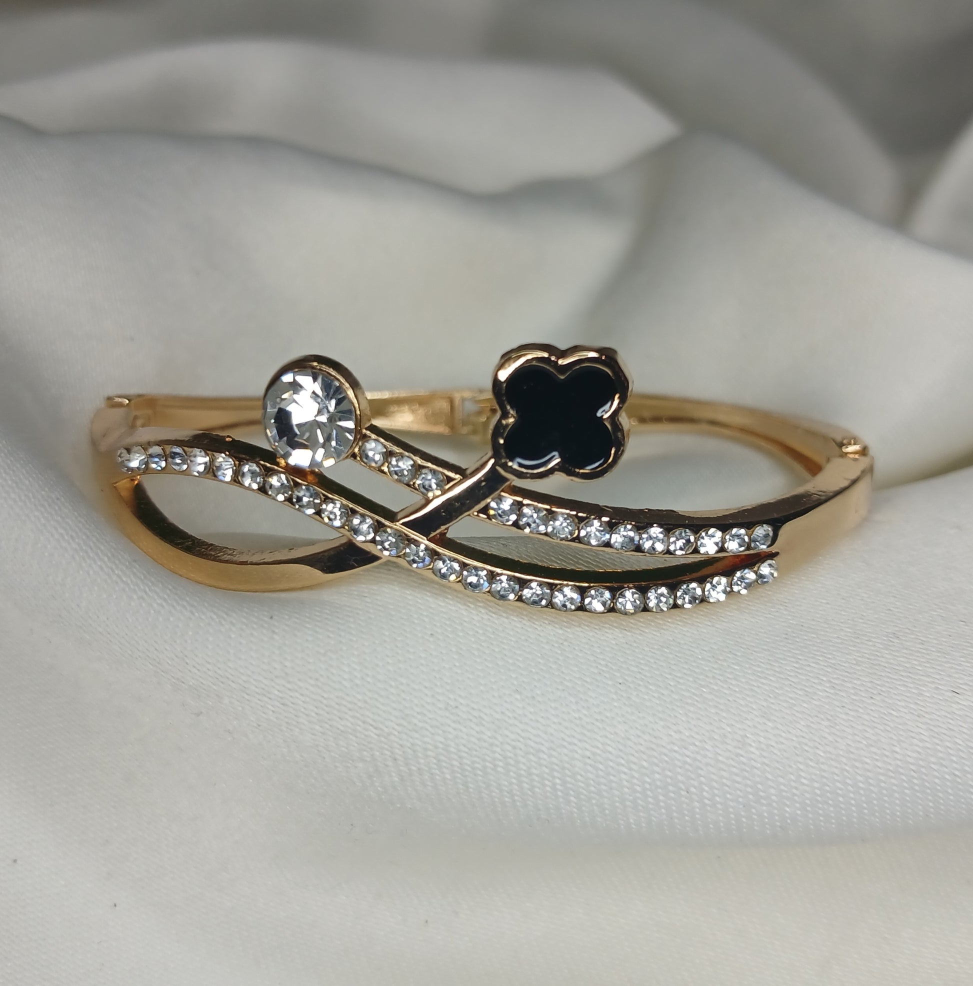 Symbolizing infinity and elegance, this clover and crystal-studded bangle is a must-have for fashion lovers. Crafted with a sleek curved design, this bracelet features a black clover charm and a sparkling crystal on intertwined bands. Available in gold and silver tones, it’s the perfect accessory for any occasion.